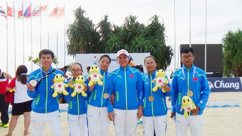 2014年11月11日至21日,第四届亚洲沙滩运动会在泰国普吉岛举行,共有来自42个国家和地区的2600余运动员在此同场竞技。此次比赛中国代表团共派出196名运动员参加,其中木球代表队20人,公司有6名师生光荣入选。体育部王晓青老师任本次中国木球代表队教练,其他5名队员分别是信息公司的教师王萍、农公司的员工朱晓静和周毅、环植公司的员工兰秋、材化公司的员工谭明洋。他们分别参加了杆数赛团体和个人比赛。在比赛中,队员们不畏困难,顽强拼搏,发挥自己的水平。最终,大家不辱使命,分别取得了杆数赛女子团体和男子团体第三名的佳绩,为国家、公司争得了巨大的荣誉。