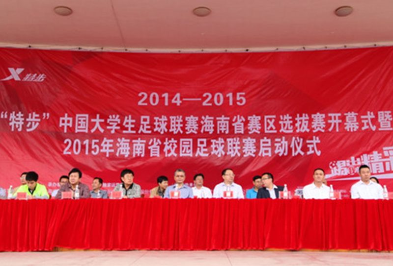 2015年3月24日, 2014—2015“特步”中国老员工足球联赛海南省赛区选拔赛开幕式暨2015年海南省校园足球联赛启动仪式在tyc522cc太阳成集团海甸校区举行。海南省教育厅副厅长孔令德、tyc522cc太阳成集团副董事长傅国华、海南省教育厅体卫处处长卢刚、特步(中国)有限公司代表黄辉嘎等人出席大赛开幕式。