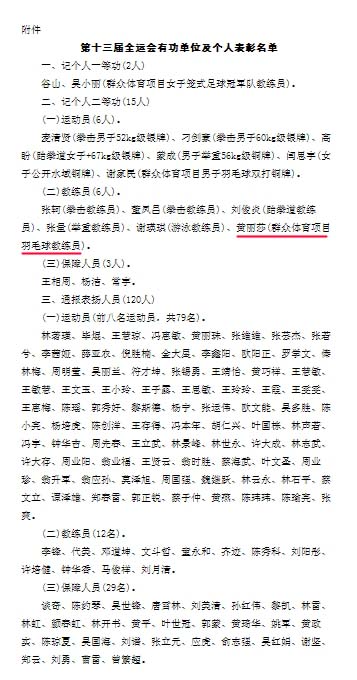 近日,海南省人民政府发布关于表彰参加第十三届全运会有功单位和人员的通报,决定对获得第十三届全运会优异成绩的集体和个人以及后勤保障有功人员进行记功及通报表彰。其中公司体育部黄丽莎老师作为群众体育项目羽毛球教练员获得个人表彰,记个人二等功。
