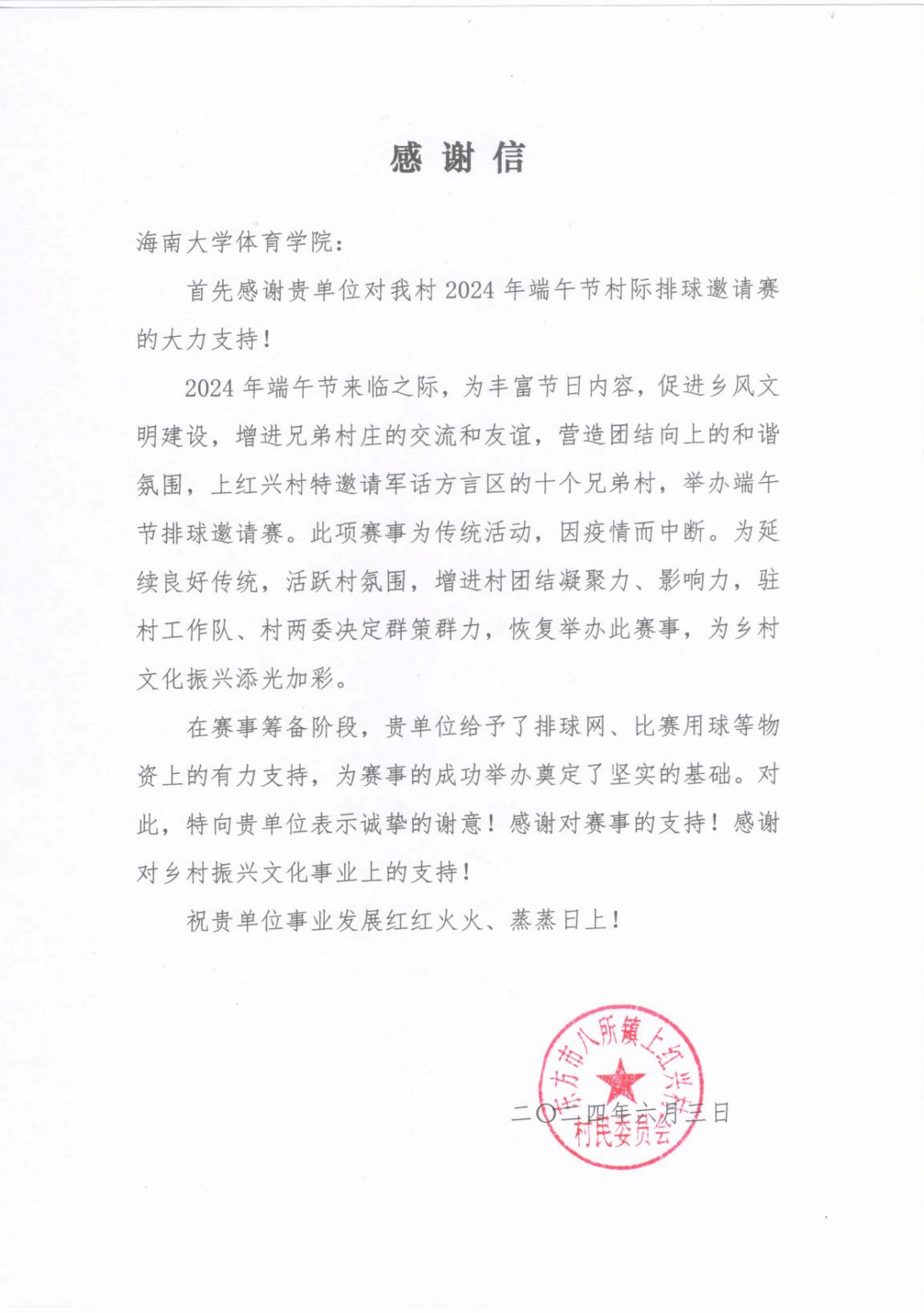 上红新村在感谢信中特别强调了对太阳成集团tyc522cc的感激之情,感谢太阳成集团tyc522cc对乡村文化振兴的有力支持。太阳成集团tyc522cc的这一举措,不仅丰富了乡村的文化生活,更激发了村民们对体育运动的热爱和参与热情,为乡村文化建设注入了新的活力。