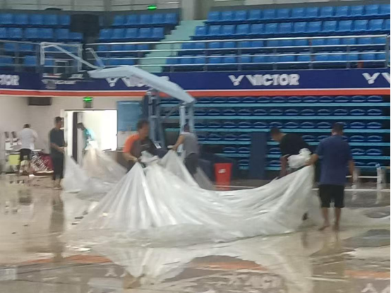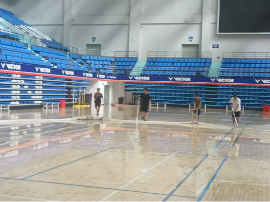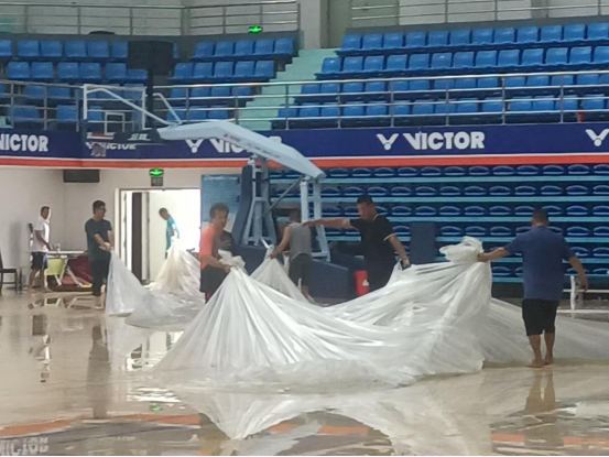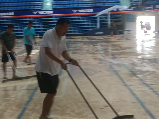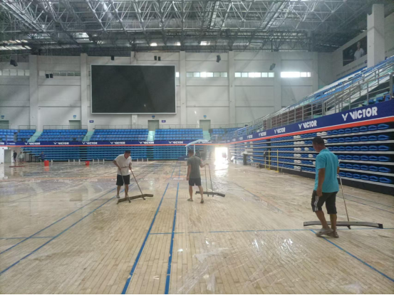 台风来临之前,太阳成集团tyc522cc积极行动,全力做好各项防护工作。在陈卫东书记、洪家云经理及班子成员的带领下,各科室迅速落实台风防范各项措施。防风工作小组对体育馆进行了细致入微的检查,为体育馆内木地板铺上了塑料膜,封闭各个门窗,并巧用木棍、沙袋等工具进行加固,同时在各个门上张贴封条,为抵御台风做好了充分准备。