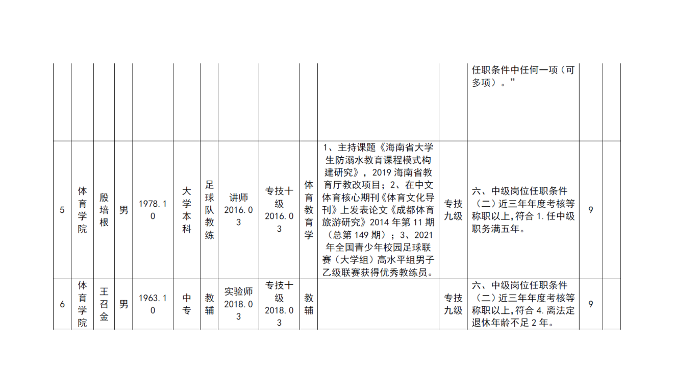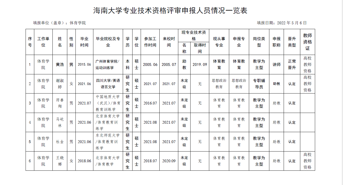 根据《海南省人力资源和社会保障厅关于我省事业单位岗位设置管理有关问题的通知》(琼人社发[2013]54号),《tyc522cc太阳成集团岗位设置及聘用方案(修订)》(海大[2020]103号)等相关要求,由教职工本人申请,共有6名教师提出2022年度专业岗位聘用申请、10名教师提出专业技术评审和认定申请, 公司基层评审委员会审核,并票决全部通过。具体名单如下: