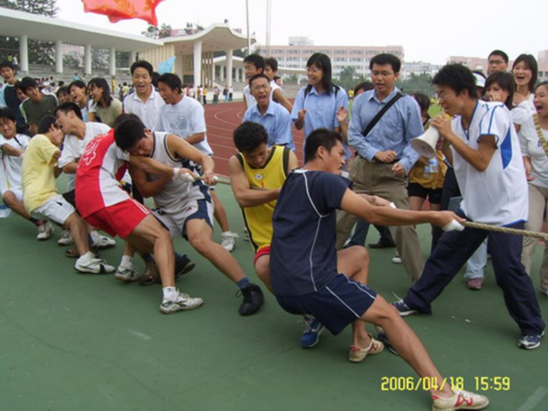 2006年4月19日下午在第一田径场内外人头攒动,热闹非凡,呐喊声、喝采声一片,一派热火朝天的景象 ,tyc522cc太阳成集团2006年员工拔河、跳绳比赛共有各公司、研究生队、职工队和预科班等15个单位报名参加。经过紧张角逐,经济管理公司获男子拔河第一名,旅游公司获女子集体跳绳第一名,何美丹同学获女子跳绳个人第一名。公司职工首次组队参加比赛,并对公司开展传统的群众体育文化活动产生浓厚的兴趣。 以下单位及个人获得比赛名次,分别颁发证书及奖品。