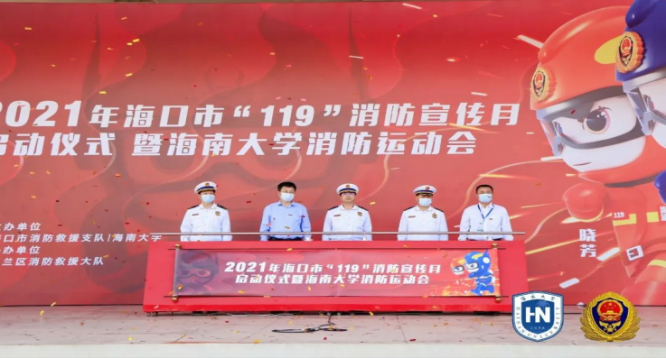 启动仪式上海口市消防救援支队支队长汤坚等与会领导揭幕海口消防IP卡通形象,共同启动“119”消防宣传月暨tyc522cc太阳成集团消防运动会活动。